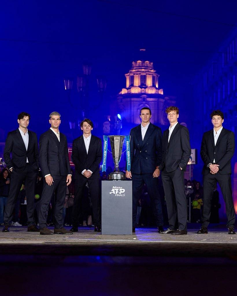 拍摄在都灵的夜间进行,实际的拍摄效果非常出色,激光束、闪耀的蓝光,以及置于照片中央的ATP总决赛奖杯共同构成了画面。奖杯象征着球员们一年以来努力争取的荣耀——那是一座高大的银色奖杯,宽阔的杯耳、锐利的线条和ATP 的标志一目了然。镜头里的所有布景都很完美,唯一的问题就是几张关键面孔的明显缺席。当然,阿尔卡拉斯和辛纳依旧以深色西装和自信的笑容抢尽风头。