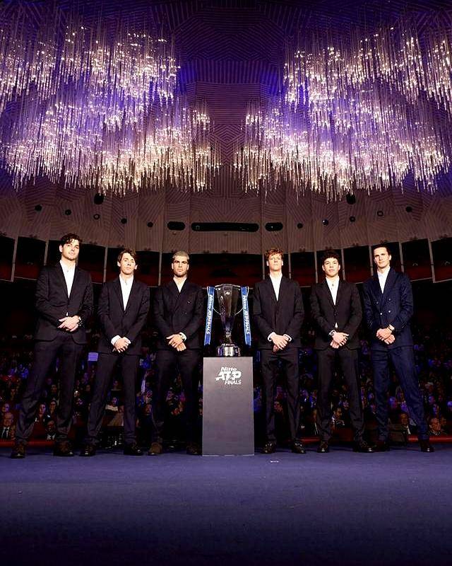 但今年,这张照片却成了“半家福”——只有六个人出镜。阿尔卡拉斯、辛纳、兹维列夫、弗里茨、谢尔顿和德米纳尔西装笔挺地站在都灵的灯光下,背景是炫酷的激光和闪亮的ATP总决赛奖杯,画面确实挺酷。可问题是,球迷们左看右看,总觉得少了点什么。