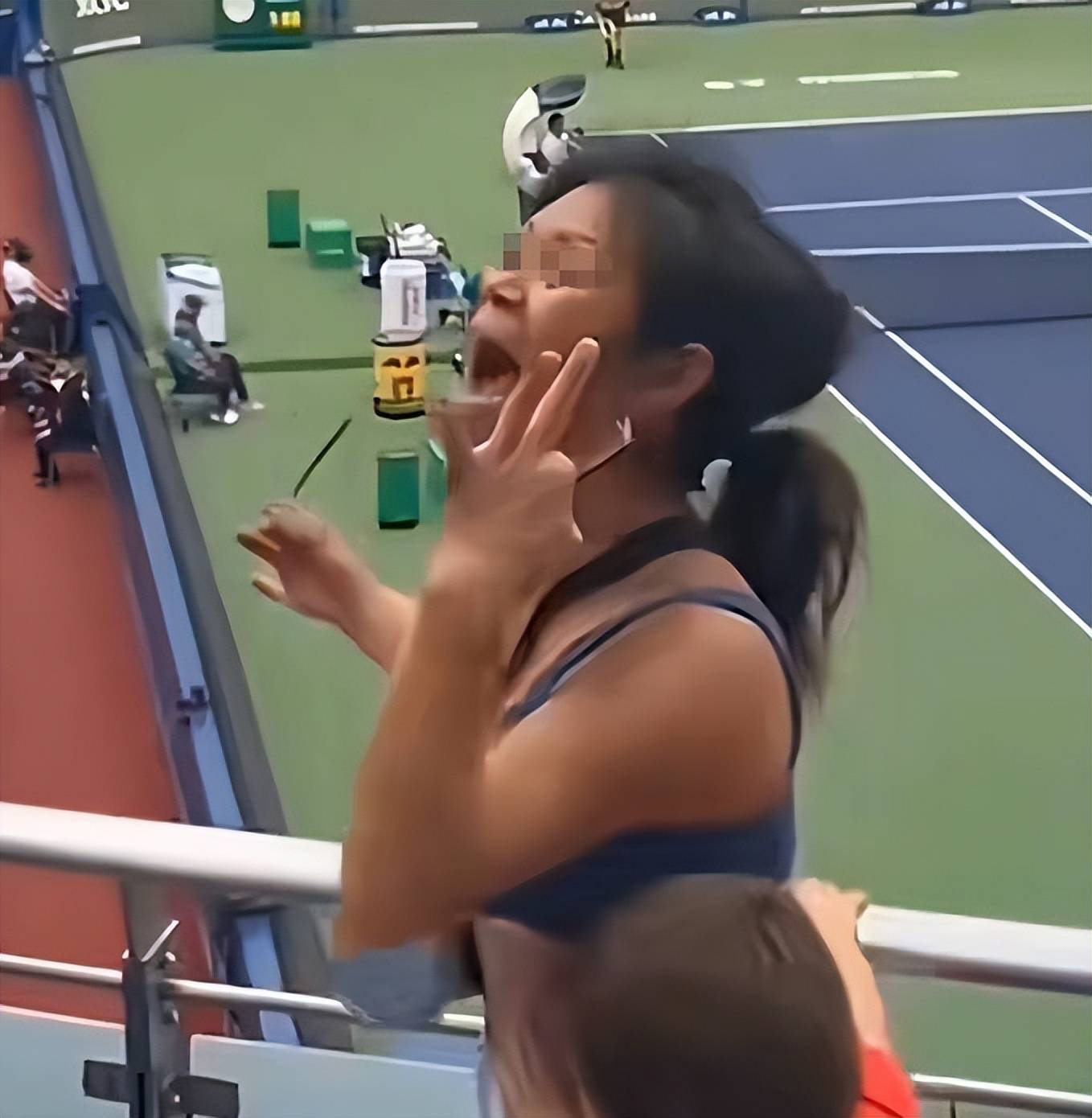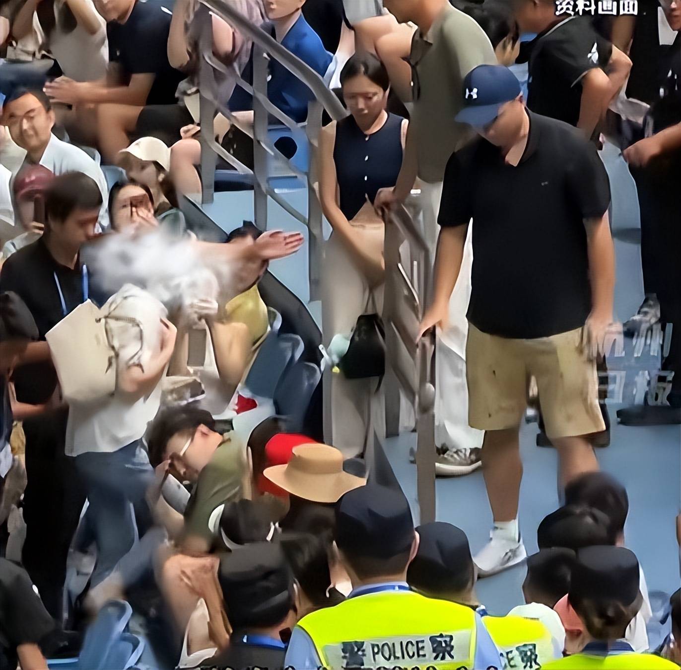 在比赛的关键时刻,观众席中开始出现争执声,并逐渐升级为激烈的争吵,甚至夹杂着“滚出去”的怒吼。众人循声望去,只见一位身穿外套、留着短发的中年女子情绪激动,手舞足蹈地与周围观众争论不休,口中还不时冒出不雅之词。这场骚动直接导致比赛中断,原本紧张专注的氛围荡然无存。