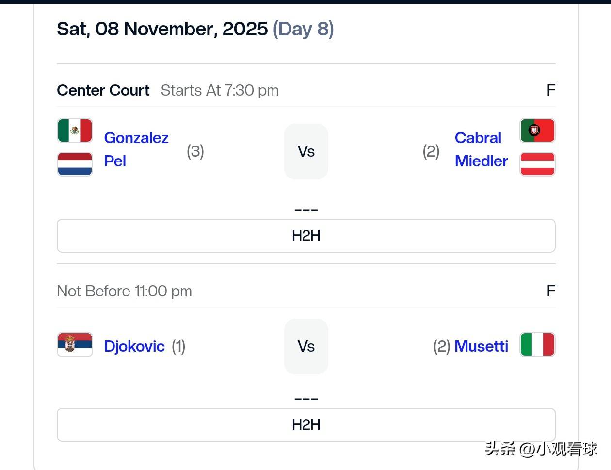 雅典锦标赛的决赛将在今晚11:00展开,德约科维奇与穆塞蒂的交手记录为8:1。穆塞蒂唯一一场战胜德约科维奇的比赛发生在2023年蒙特卡洛大师赛第三轮。
