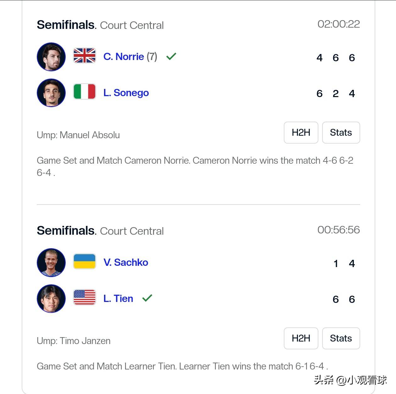 在半决赛中,诺里(7号种子)以4-6/6-2/6-4逆转战胜了索内戈。诺里近期状态回升,表现越来越出色。