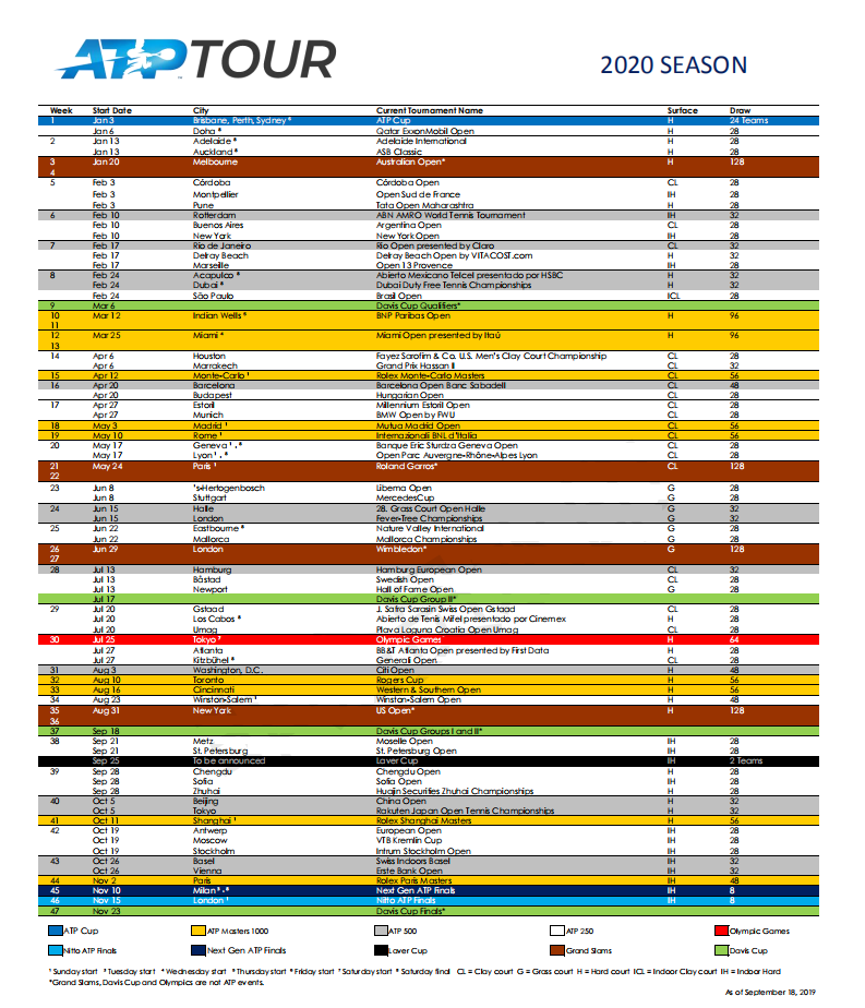 2020赛季ATP赛事将从1月3日正式打响,全新的ATP世界杯赛事将会成为新赛季的揭幕之战。首届ATP世界杯将会有24支球队参加,包括了三巨头在内的世界前十都将会参加该项赛事。澳网赛事仍将会在新赛季第3周来举行,届时128位参赛球员将会争夺新赛季的首项大满贯赛事的冠军。