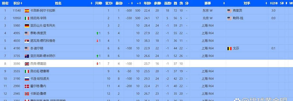 阿尔卡拉斯在东京夺冠成功保住了去年在中网赛上的积分,目前以11540分稳居世界第一;而辛纳在北京夺冠后,积分累计达到10950分,距离领先者阿尔卡拉斯的11540分只差590分。去年,辛纳在上海大师赛夺冠,而阿尔卡拉斯止步八强,所以辛纳此次在上海的表现将直接影响年终世界第一的争夺格局。