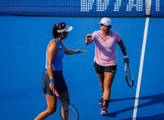双打赛场:在首轮一场较量中,中国海峡组合蒋欣玗/詹皓晴以6-2 6-4击败本土外卡组合园部八奏/内岛萌夏,晋级八强。